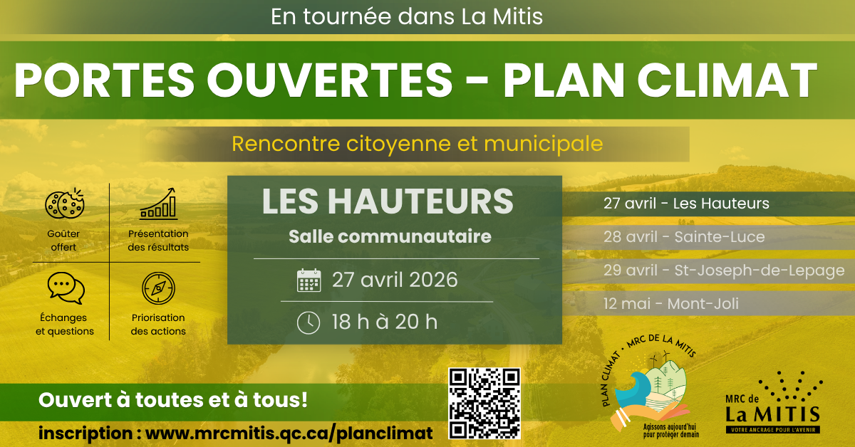 La MRC de La Mitis lance officiellement sa tournée de portes ouvertes citoyennes et municipales dans le cadre du Plan climat, qui se tiendra dans les prochaines semaines à travers le territoire.
